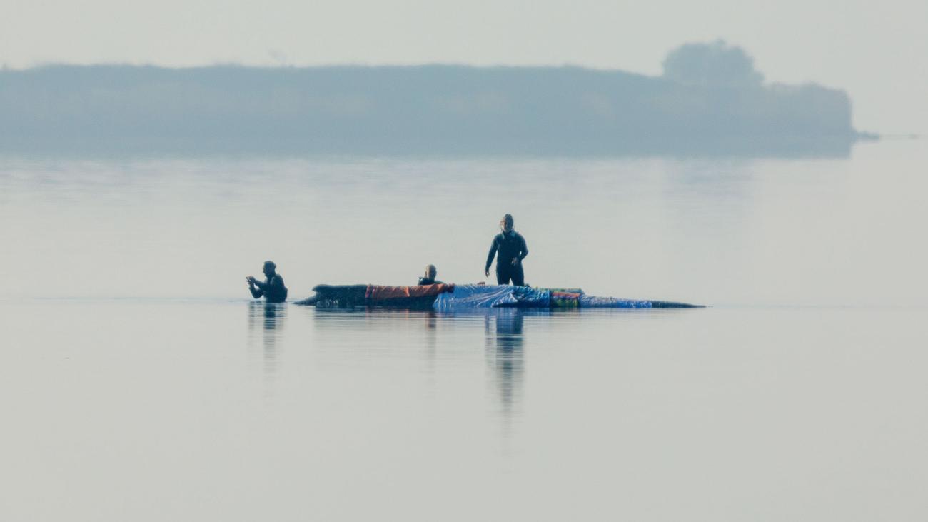 Taucher steigen ins Wasser. Parallel bereiten die Helfer den nächsten Schritt