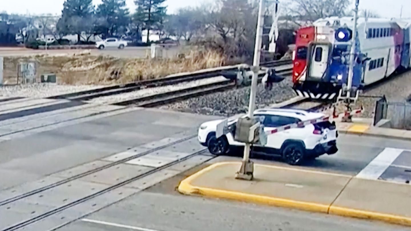 In Utah wird ein SUV von seinem nachfolgenden Wagen hinter die Absperrung einer Bahngleise geschoben – und dann von dem heranfahrenden Zug zertrümmert. Verletzt wird dabei niemand.