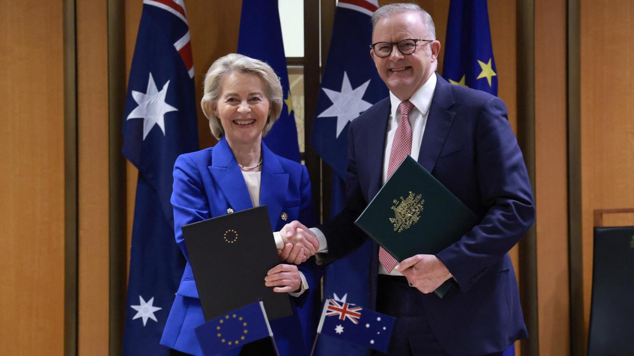 Die Europäische Union und Australien haben sich rund acht Jahre nach dem Beginn erster Verhandlungen auf ein Freihandelsabkommen verständigt. Das teilten EU-Kommissionspräsidentin Ursula von der Leyen und Premierminister Anthony Albanese in der australischen Hauptstadt Canberra mit.